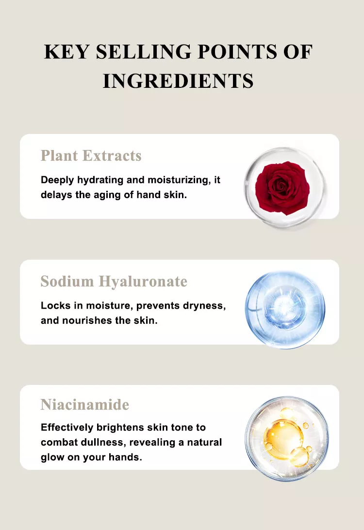 Nadat die Quick Absorption Immediate Relief Hand Cream gebruik is, word die vel meer delikaat, fyn lyne word verminder, en die waterinhoud van die vel word verhoog.Handeroom is geskik vir verskeie geleenthede in die daaglikse lewe, veral vir diegene wat gereeld hul hande was, met skoonmaakmiddels in aanraking kom, of aan droë, koue omgewings blootgestel word. Of dit nou vir tuisversorging, kantoorinstellings of buitelugaktiwiteite is, tydige toediening van handeroom beskerm jou hande effektief en hou gesonde, jeugdige vel in stand.