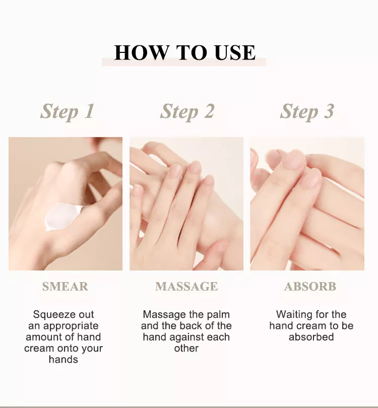 Die Quick Absorption Immediate Relief Handeroom het 'n romerige tekstuur, soortgelyk aan dié van melk.Dit is hoe die produk gebruik word: